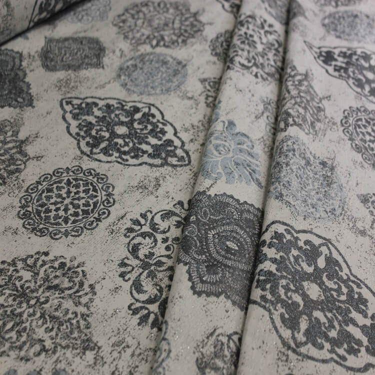 Tejido tipo jaquard labrado a dos caras con dibujo haciendo medallón de estilo arabesco, detalle en la trama del hilo de lurex oro ó plata según el color del tejido.